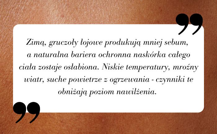 Zima to bardzo wymagający czas dla skóry. Wiele z nas boryka się nie tylko z suchą skórą twarzy. Zimą, gruczoły łojowe produkują mniej sebum, a naturalna bariera ochronna naskórka całego ciała zostaje osłabiona. Niskie temperatury, mroźny wiatr, suche powietrze z ogrzewania - czynniki te obniżają poziom nawilżenia. Wszystko to skutkuje nieprzyjemnym uczuciem napięcia, szorstkością skóry i widoczną utratą jej elastyczności. W dłuższej perspektywie także uszkodzeniem warstwy ochronnej i podrażnieniami.