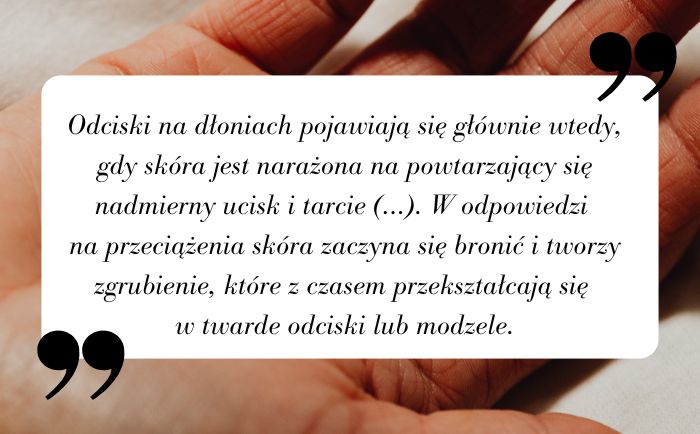Odciski na dłoniach pojawiają się głównie w wyniku powtarzającego się tarcia i ucisku. Najczęściej są efektem pracy fizycznej, podnoszenia ciężarów, mocnego chwytu narzędzi lub sprzętu sportowego. Skóra broni się przed podrażnieniem – pogrubia się i tworzy zrogowacenia, które z czasem przekształcają się w odciski.