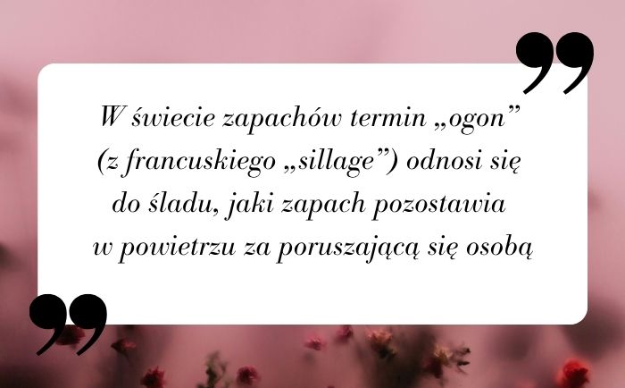 W świecie zapachów termin „ogon” (z francuskiego „sillage”) odnosi się do śladu, jaki zapach pozostawia w powietrzu za poruszającą się osobą. To właśnie wyczuwalna aura, która sprawia, że obecność kogoś, kto przeszedł obok, pozostaje w pamięci jeszcze przez dłuższą chwilę. Często dochodzi do mylenia tego pojęcia z trwałością, jednak perfumy z ogonem skupiają się przede wszystkim na mocnej projekcji, czyli zasięgu, w jakim działają perfumy.