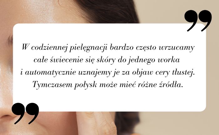 Jak widzisz, powodów pojawienia się połysku, który nie wynika z faktu posiadania skóry tłustej, może być wiele. Zanim uznasz cerę za przetłuszczającą się, warto przeanalizować zarówno używane w domowej pielęgnacji produkty, jak i codzienne nawyki pielęgnacyjne. Czasem zmiana formuły kremu lub dokładniejszy demakijaż wystarczą, aby cera stała się mniej podatna na problem.
