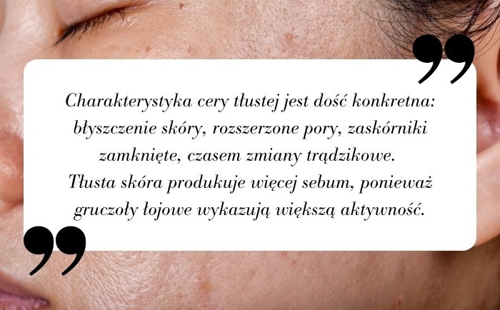 Charakterystyka cery tłustej jest dość konkretna: błyszczenie skóry, rozszerzone pory, zaskórniki zamknięte, czasem zmiany trądzikowe. Tłusta skóra produkuje więcej sebum, ponieważ gruczoły łojowe wykazują większą aktywność. Nadmierna aktywność gruczołów łojowych może mieć podłoże genetyczne, hormonalne (wahania hormonalne, zaburzenia hormonalne, okresie dojrzewania), ale też środowiskowe – długotrwały stres, nieodpowiednia dieta czy nadmierna ekspozycja na promieni słonecznych.