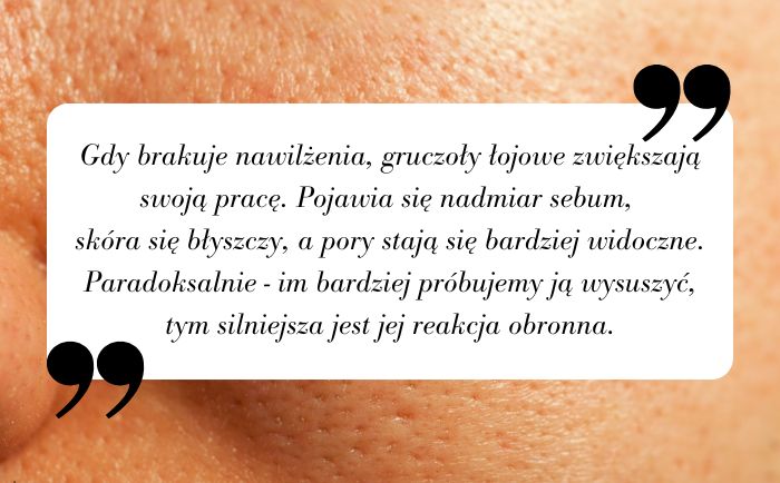 - pojawia się nadprodukcja sebum, która nie ma nic wspólnego z poziomem nawilżenia,