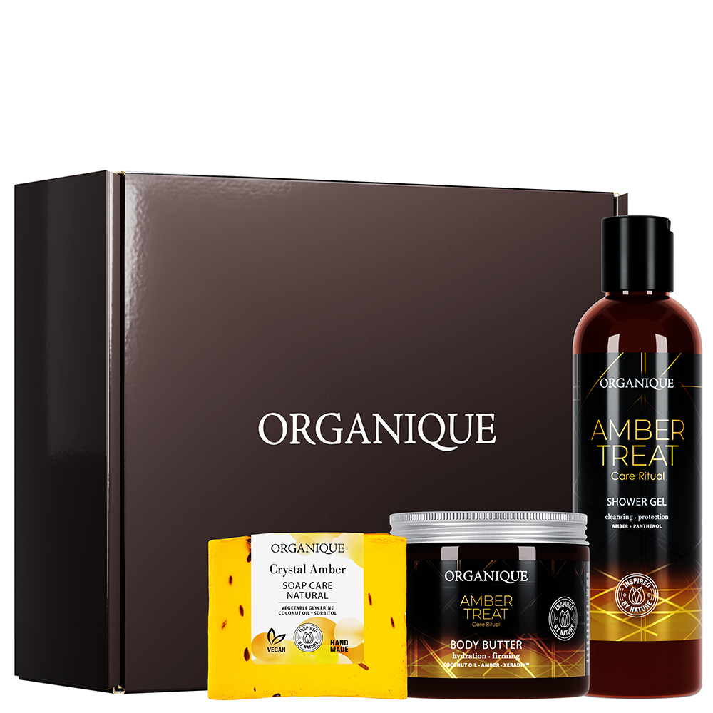 Kosmetyki naturalne OrganiquePakiet pełnej, bursztynowej pielęgnacji ciała Najlepsze rezultaty w swojej pielęgnacji do ciała zauważysz, kiedy zastosujesz produkty, które współgrają ze sobą i działają w tym samym kierunku. Odkryj bursztynową pielęgnację Amber Treat, która składa się z 4 kosmetyków działających w symbiozie dla Ciebie. W każdym z nich znajdziesz cenny składnik aktywny - ekstrakt z bursztynu. Jest on wysoko cenionym surowcem w świecie kosmetologii ze względu na swoje niezwykłe działanie - ujędrniające, antyoksydacyjne i poprawiające koloryt skóry. Zanurz się w bursztynowej pielęgnacji i niezwykle ciepłym, otulającym zapachu wykorzystywanym w luksusowych perfumach. Aromat jaśminu, szafranu, karmelizowanego cukru i ambry, przeniesie Cię do aromatycznych wakacji w pełnym słońcu. Wszystko, czego potrzebuje Twoja skóra Cały bursztynowy rytuał rozpocznij od prysznica lub kąpieli z naturalnym żelem pod prysznic Amber Treat. Już na etapie oczyszczania skóry dostarczysz jej składniki aktywne, które poprawią jędrność i napięcie naskórka. Intrygujący zapach otuli Twoje zmysły i wprawi Cię w lepszy nastój. Aby skóra była dobrze odżywiona, gładka i sprężysta, stale ją złuszczaj. Peelingowanie ciała sprawi, że poczujesz pozytywną zmianę w jej jakości już po pierwszym razie! Cukrowy peeling do ciała Amber Treat ma lekką, żelową konsystencję łatwą zarówno do do rozprowadzenia, jak i spłukania. Nie pozostawia po sobie tłustego wykończenia, więc sprawdzi się na letnie, parne dni. Zastosowaliśmy w nim aż 2 rodzaje eksfoliatorów - kryształki cukru oraz szlachetny, zmielony bursztyn. Oprócz samej eksfoliacji peeling do ciała zawiera ekstrakt z bursztynu, który łatwiej wnika dzięki usunięciu martwego naskórka. Kolejny etap pielęgnacji to to, co kochamy najbardziej (i nasza skóra także) - nawilżanie. W tym pakiecie otrzymasz zarówno lekkie masło do ciała, idealne na szybszą pielęgnację, jak i cięższy balsam z masłem shea, który sprawdzi się po opalaniu, czy przesuszeniu skóry. Oba zawierają ekstrakt z bursztynu, który ujędrnia i uelastycznia skórę. Dodatkowo ujednolica jej kolor i działa antyoksydacyjnie, czyli przeciwstarzeniowo. Pakiet NIE jest pakowany w pudełko prezentowe. ZESTAW ZAWIERA: Żel pod prysznic / Amber Treat / 250ml Lekkie masło do ciała / Amber Treat / 200ml Balsam z masłem Shea / Amber Treat / 200g Peeling do ciała / Amber Treat / 200g