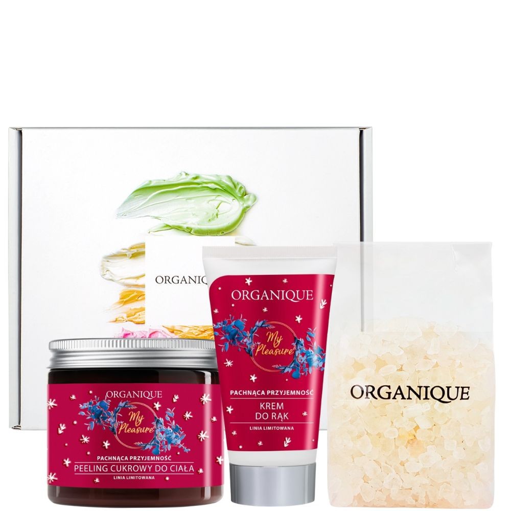 Żelowy peeling My Pleasue z technologią widocznej witaminy E działa jak antyoksydacyjny zastrzyk dla skóry, neutralizując wolne rodniki i wzmacniając barierę hydrolipidową skóry. Kryształki cukru złuszczają martwy naskórek, wspomagają mikrocyrkulację, a przy tym silnie nawilżają, pozostawiając skórę przyjemnie gładką i wypielęgnowaną. Relaksująca sól do kąpieli to bogactwo minerałów i pierwiastków śladowych, które wspomagają detosykację, redukują obrzęki, a także łagodzą stany zapalne. Doskonałym uzupełnieniem prezentu jest regenerujący krem do rąk o lekkiej, aksamitnej konsystencji i bogatym składzie. Roślinne oleje dogłębnie odżywiają, koją podrażnienia i chronią przed ucieczką wody nawet bardzo suchą skórę dłoni. Roślinne ekstrakty wspomagają gojenie i zmniejszają przebarwienia, pozostawiając ją wygładzoną i przyjemnie miękką.