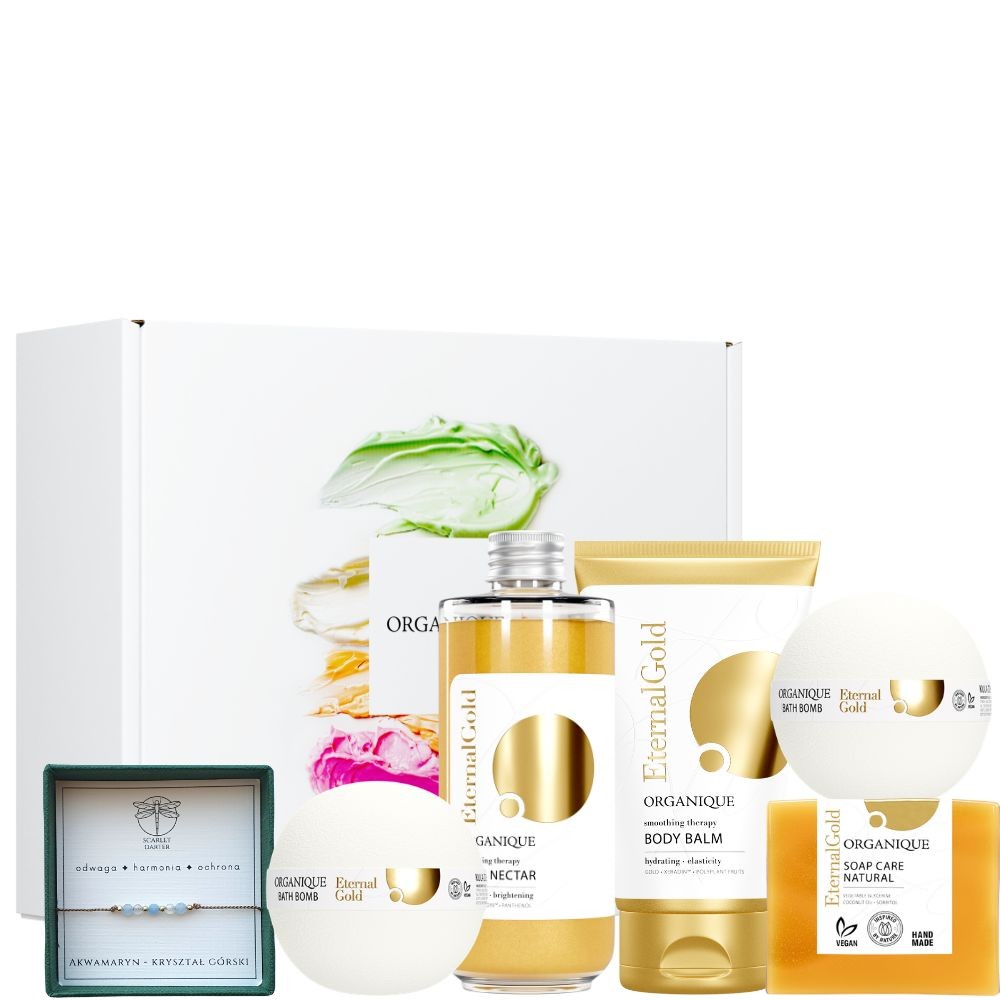 - Rozświetlający nektar do kąpieli Eternal Gold: po dodaniu do wody zmienia kąpiel w aromatyczny rytuał. Aksamitna piana zapewnia skórze delikatne oczyszczenie oraz odmładzającą pielęgnację, dzięki zawartości zmikronizowanego złota.