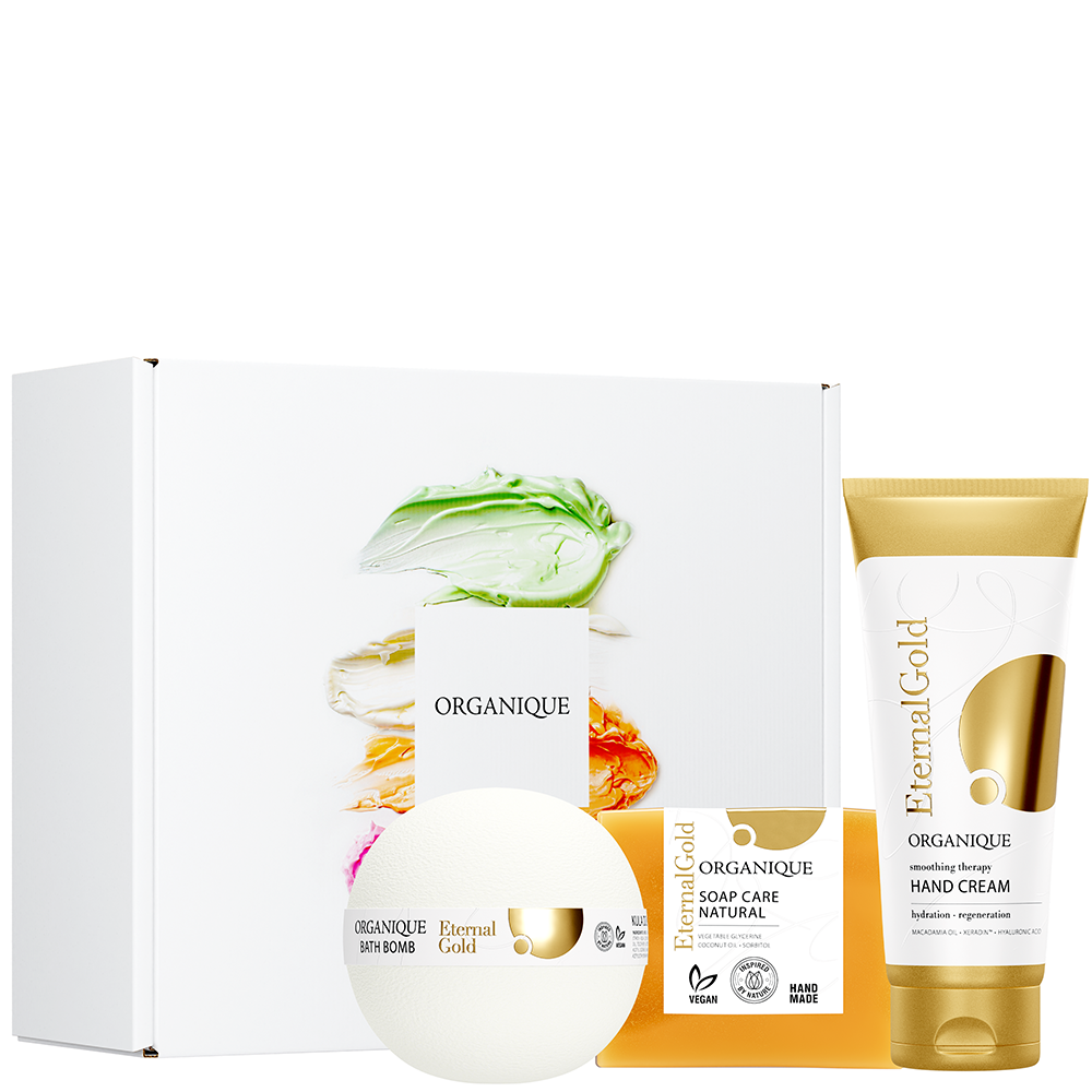 Szukasz upominku, który będzie zarówno elegancki, jak i praktyczny? Ten zestaw kosmetyków to niewielki, ale elegancki i niezwykle wartościowy prezent dla każdego! Zestawiliśmy w nim trzy kosmetyki, które łączy skuteczność naturalnych składników i wyjątkowy aromat linii Eternal Gold: odżywcza kula do kąpieli, ręcznie robione mydło pielęgnujące oraz rozjaśniający krem do rąk - całość w brandowanym pudełku prezentowym. To uniwersalny upominek, który sprawdzi się zarówno dla kobiety, jak i mężczyzny, zamieniając codzienną rutynę w przyjemny, złoty rytuał.