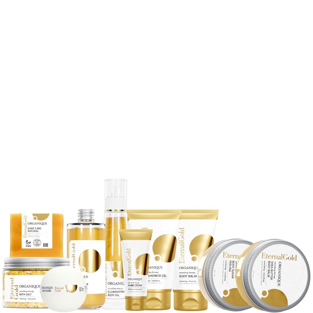 Twoje ciało zasługuje na pielęgnację premium – pełną blasku, otulającą zmysły i dbającą o każdy detal skóry. Właśnie dlatego stworzyliśmy kompletny rytuał Eternal Gold, który zamienia codzienną rutynę w prawdziwe domowe SPA. To kolekcja, w której złoto i biomimetyczne peptydy spotykają się z roślinnymi ekstraktami, aby zapewnić Twojej skórze wygładzenie, regenerację i rozświetlenie. Każdy produkt z tej linii powstał z myślą o chwili uważności i celebracji piękna, które z wiekiem – jak szlachetne złoto – tylko zyskuje na wartości.