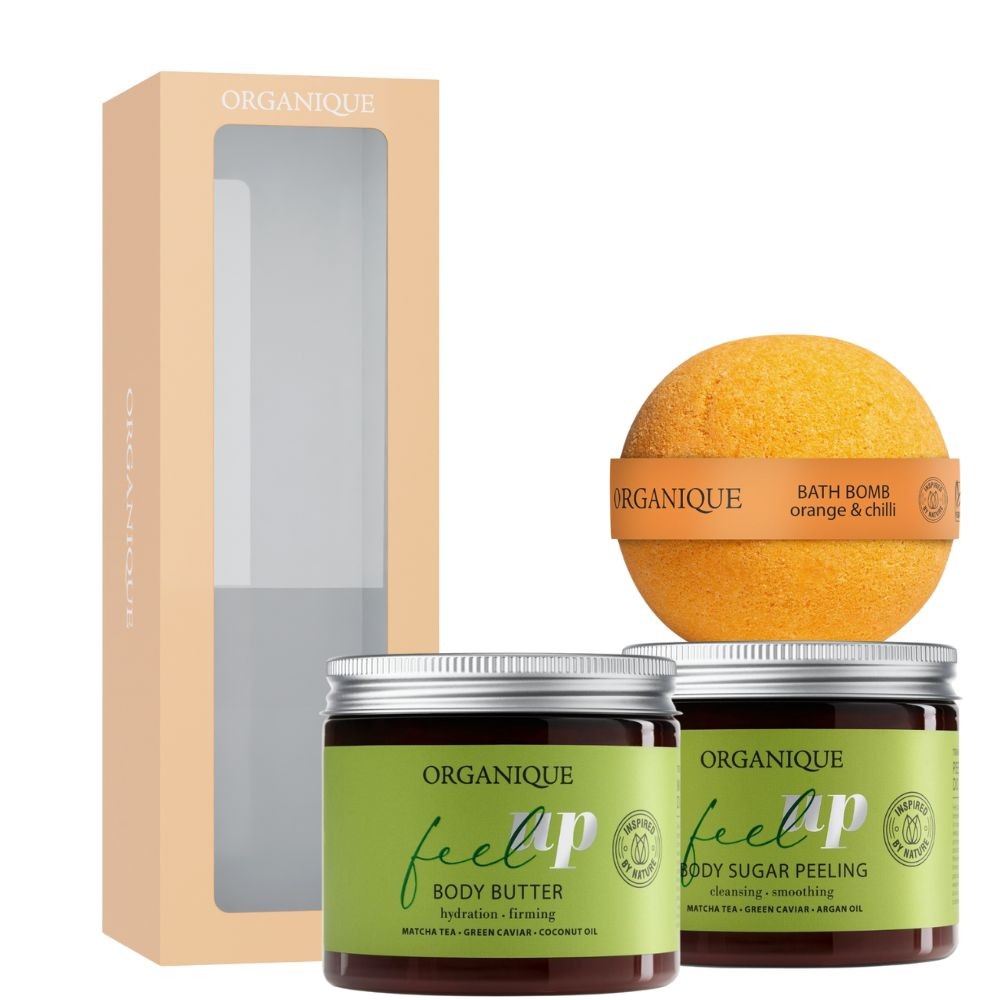 Obudź skórę i zmysły dzięki pielęgnacji pełnej witalności. Ten zestaw prezentowy to prawdziwy "smoothie" dla ciała, zaprojektowany, by dodawać energii. Rytuał rozpoczyna musująca kula do kąpieli Orange & Chilli – jej soczysty, cytrusowy aromat z pikantną nutą chili działa jak zastrzyk endorfin. Sercem zestawu jest linia Feel Up, bazująca na detoksykującej herbacie Matcha: intensywnie wygładzający peeling cukrowy oraz bogate, regenerujące masło do ciała, które otula skórę aksamitną warstwą.